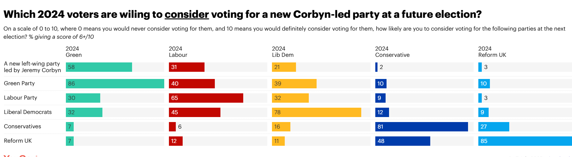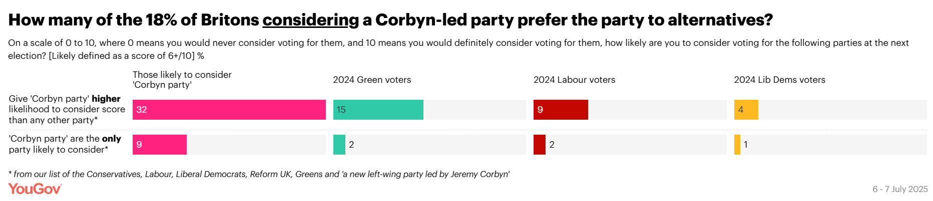 Starmer's Landslide Victory was a loveless one (based on the Tories being incompetent at... well... everything), winning only 33.7% of the popular vote (9.7 Million Votes), whereas under Corbyn's leadership the party secured 12.9 million votes (40%) in 2017, and 10.3 million votes (32.1%) in 2019. Combined with a lower left wing turnout in 2024, some voting patterns also show that Labour had already lost a significant proportion of votes to the Green Party and to a lesser extent, the Liberal Democrats according to Ipsos. Therefore, Corbyn cannot take what is already gone!